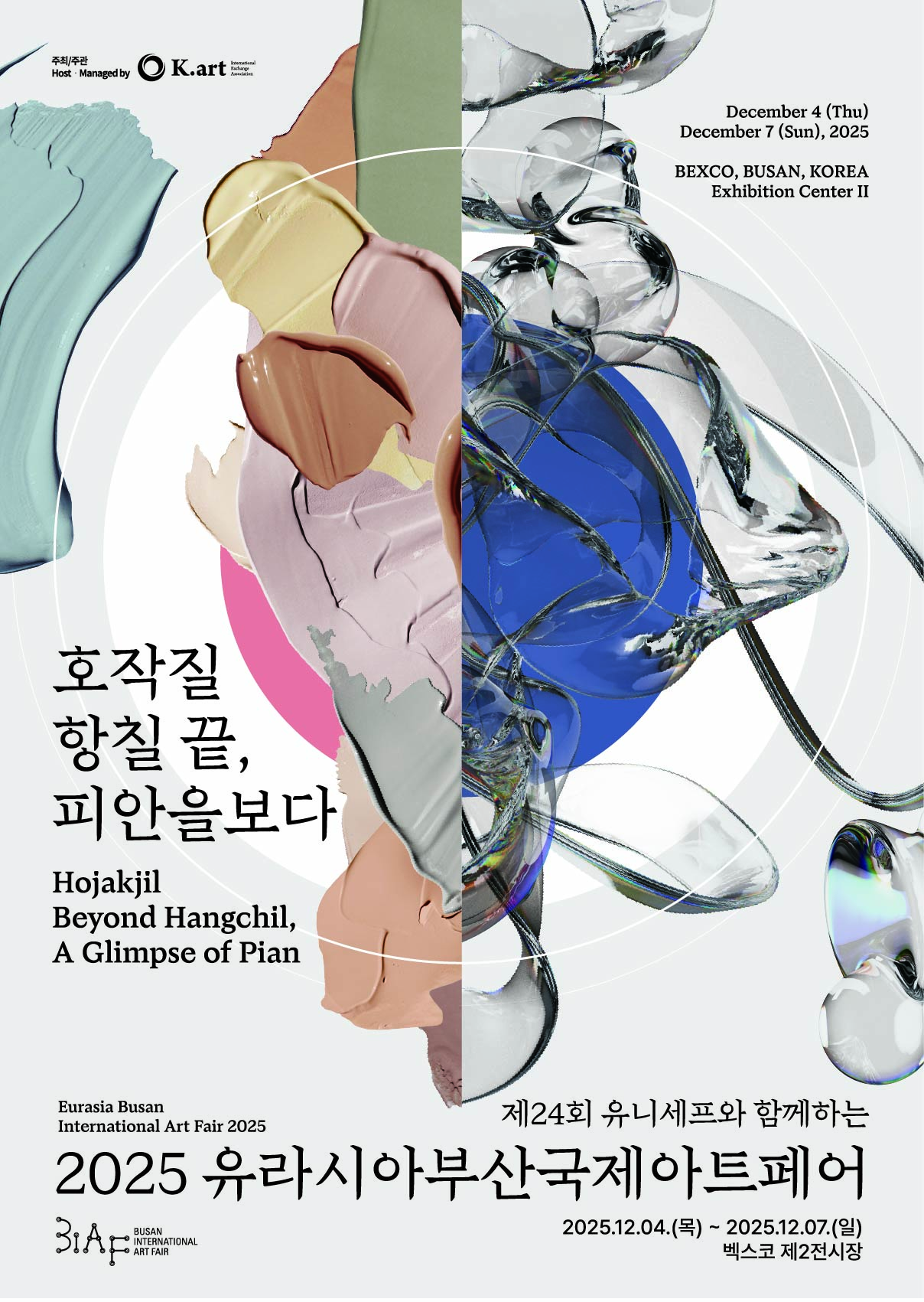 변화와 연결, 예술의 영향에 대하여, 예술과 컬렉터의 연결, 문화와 산업의 연결을 상징하는 BIAF의 심볼을 재해석한 이번 포스터는, 퍼져나가는 원을 작품이 주는 영향력으로, 변화하는 선과 점을 작가와 관객의 변화로 표현하였습니다.